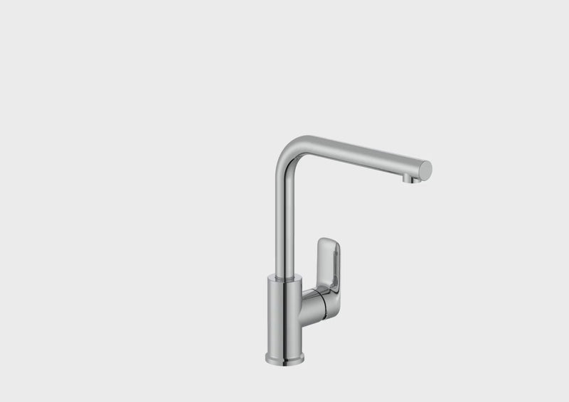 Enthält: Einhebel-Küchenarmatur mit schwenkbarem gebogenem Auslauf und Anschlussleitungen in verchromter Ausführung.