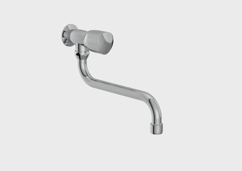 Enthält: Wandarmatur für die Küche mit schwenkbarem gebogenem Auslauf und Standardanschlüssen in verchromter Ausführung.