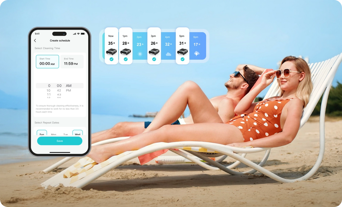 Même par temps nuageux, le Surfer S2 est à votre service. Équipé d'une batterie longue durée, une seule charge via l'adaptateur CC inclus fournit jusqu'à 35 heures d'autonomie de nettoyage. Ce système de charge double garantit que la surface de votre piscine reste impeccable, quel que soit le temps.