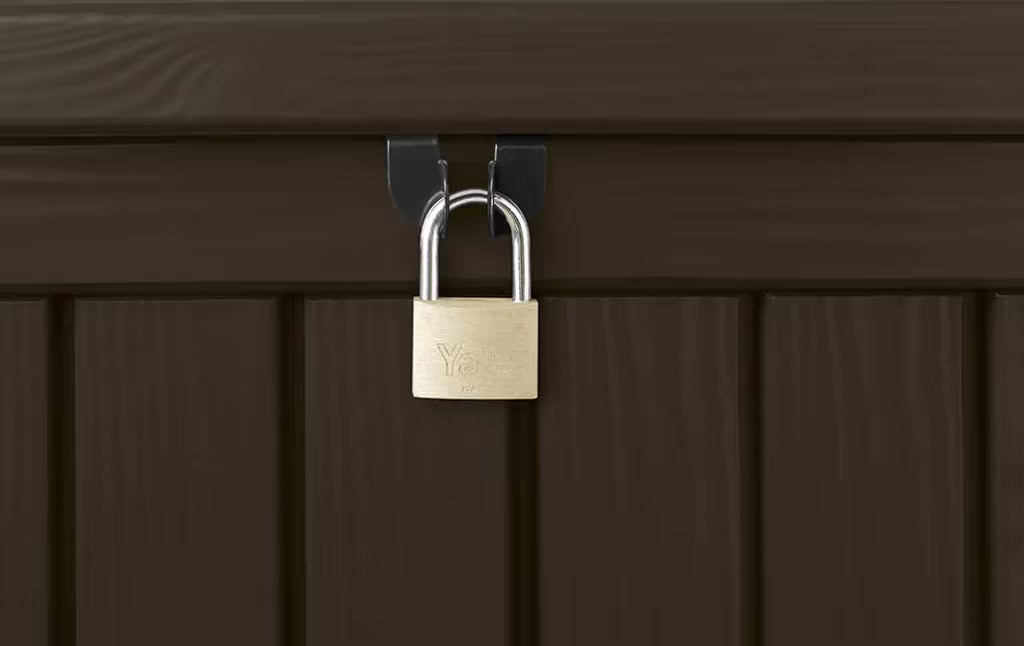 Coffre Rockwood de couleur marron, avec un design élégant effet bois et une grande capacité de stockage. Idéal pour ranger coussins, outils ou accessoires de jardin, résistant et durable.