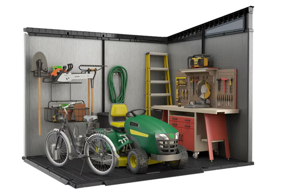 Cabane Artisan 9x7 en couleur gris, moderne et fonctionnelle, idéale pour stocker outils, vélos ou meubles de jardin. Sa structure en résine Duotech™ offre durabilité et esthétique effet bois.
