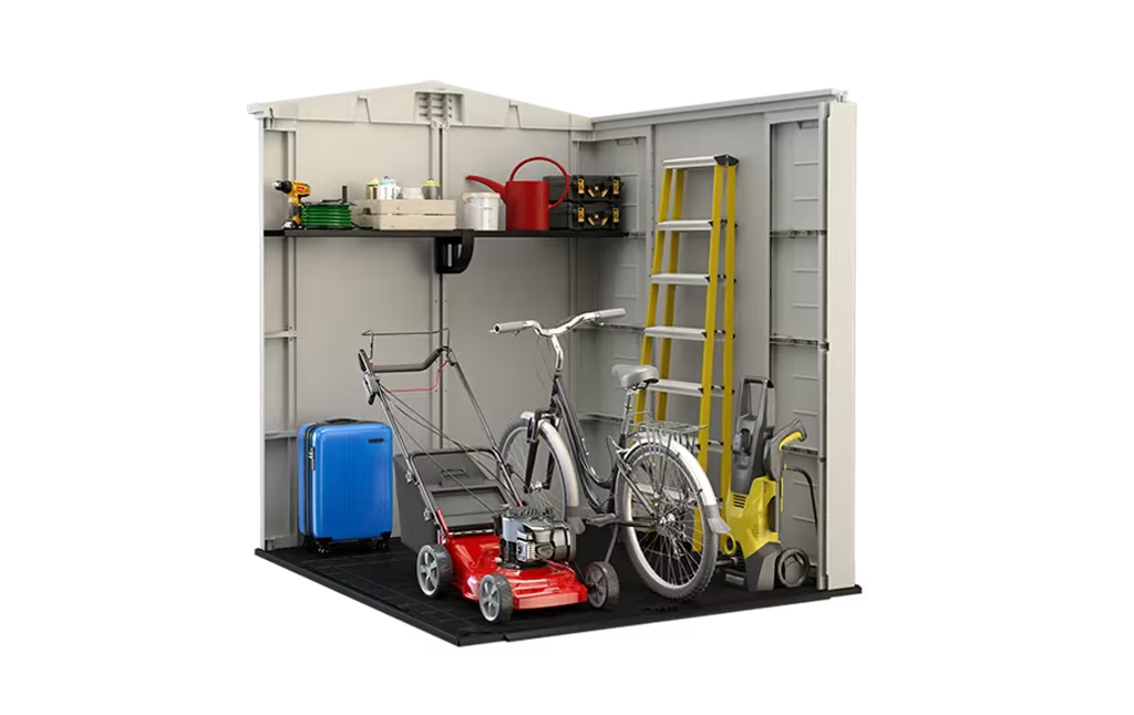 Cabane Factor 6x6 en couleur marron/beige, conçue pour stocker outils, vélos ou mobilier de jardin. Fabriquée en résine renforcée, elle allie espace, esthétique et résistance sans entretien.