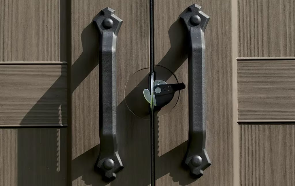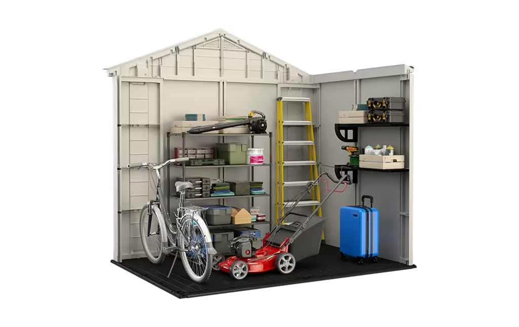 Cabane Factor 8x6 en couleur marron/beige, idéale pour stocker de gros outils, du mobilier ou des équipements de jardin. Son design effet bois et sa structure renforcée garantissent durabilité et esthétique.