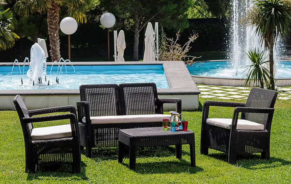 Ensemble Tarifa Lounge en finition rotin marron avec canapés, fauteuils et table. Résistant, élégant et facile à entretenir, parfait pour les terrasses, les porches ou les grands jardins.