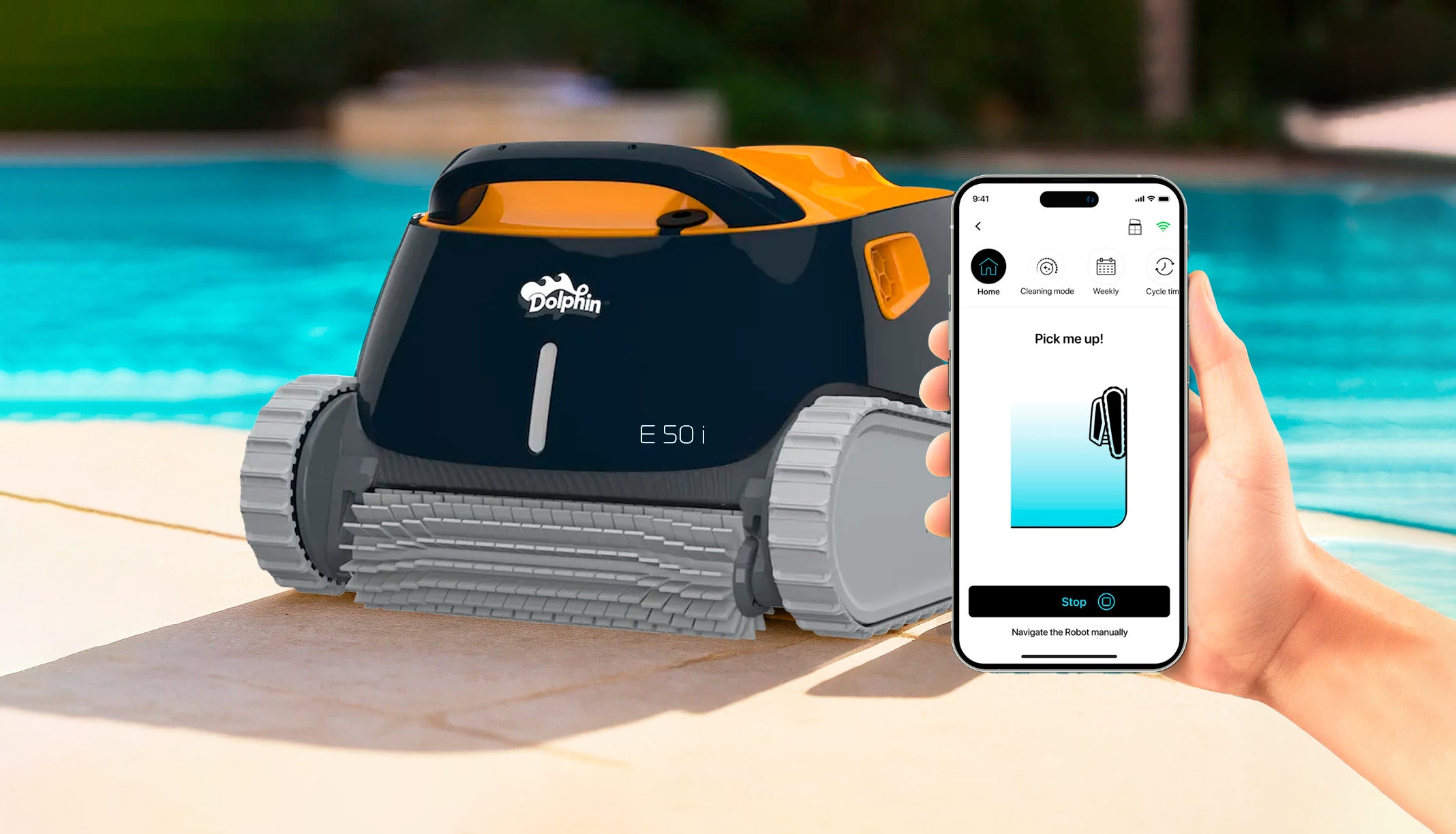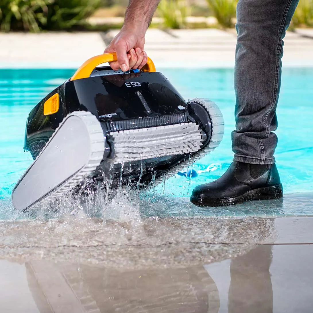 Il Dolphin E50i include la funzione innovativa Tiratemi suche consente al robot di sollevarsi fino alla linea di galleggiamento per facilitare il prelievo. Questa caratteristica, combinata con la Applicazione MyDolphin™ Plusrende ancora più comodo il suo utilizzo.