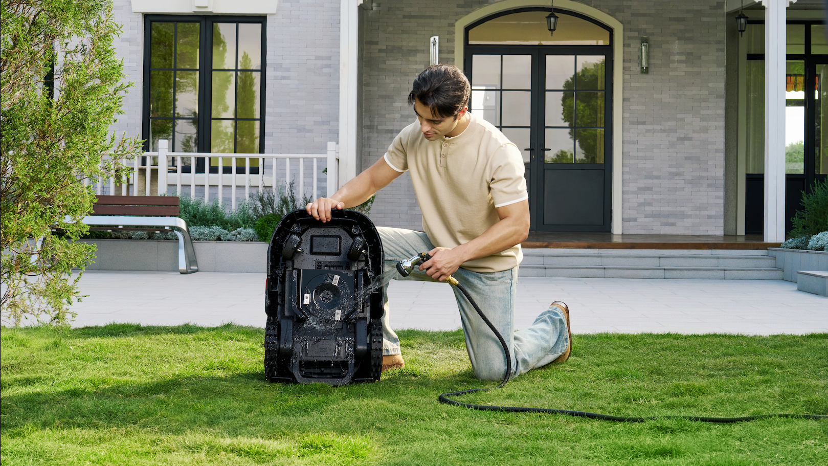 Progettato per una pulizia rapida, puoi definire punti di pulizia nell'app affinché il robot vada da solo, senza trasporto manuale. La sua protezione IPX6 permette di risciacquare l'esterno e la base per eliminare residui di erba in pochi minuti.
