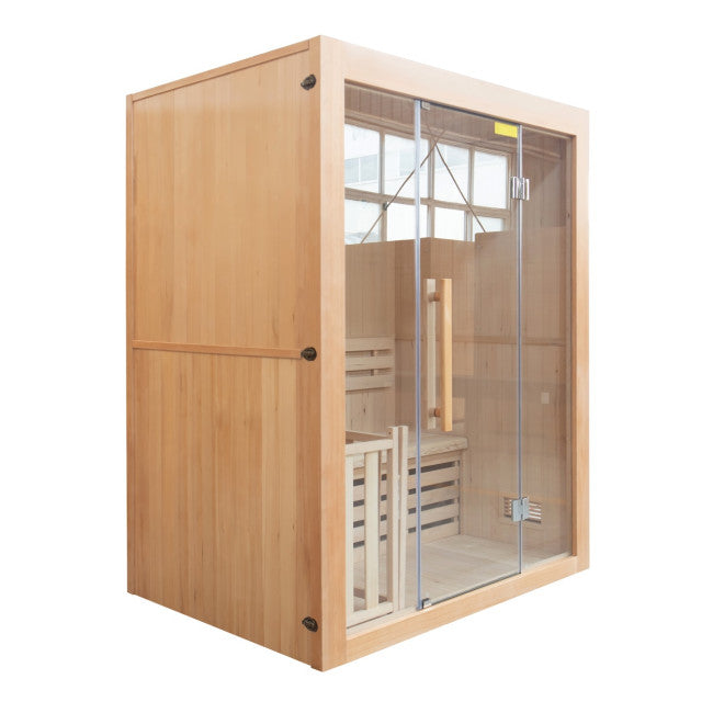 Realizzato in vetro temperato per supportare l'elevato calore della sauna a vapore, questo fronte glassato aggiunge un tocco contemporaneo allo stile tradizionale della solida cabina di fuoco.