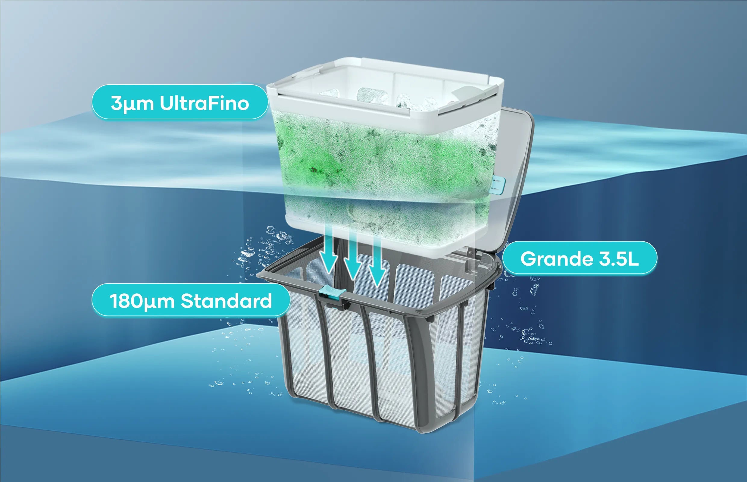 Este filtro de alta precisión captura partículas de hasta 3 micras gracias a su estructura multicapa de 5 mm, reteniendo polvo fino, algas y residuos microscópicos que otros sistemas no logran filtrar. Es reemplazable, higiénico y garantiza un agua limpia y cristalina, optimizando el rendimiento del robot en cada ciclo de limpieza.