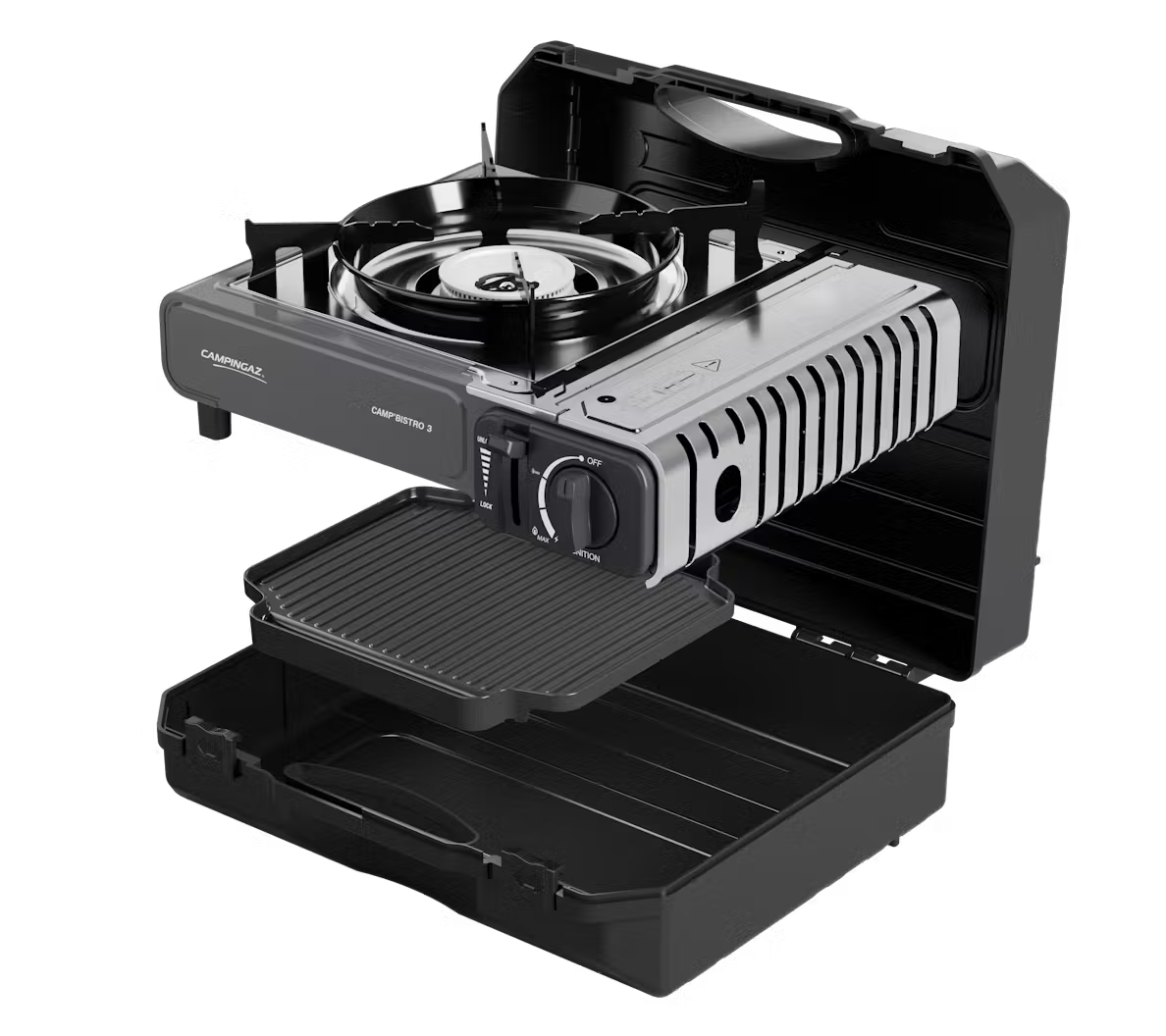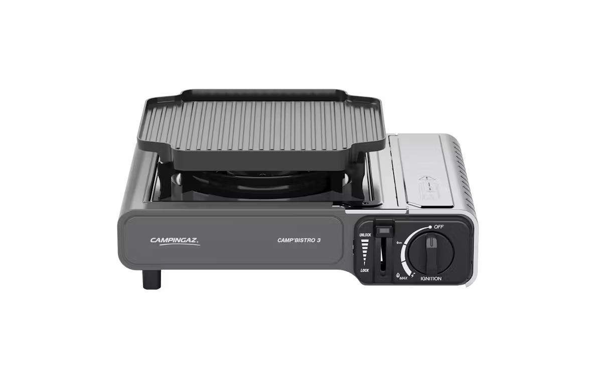 El Campingaz Bistro 3 + Griddle es un hornillo portátil ideal para camping y escapadas. Con potencia de 2.200 W y consumo reducido de 160–184 g/h, permite cocinar rápido y con eficiencia. Incluye plancha (griddle) para mayor versatilidad y cuenta con encendido piezoeléctrico y sistema de seguridad mejorado para cartuchos.