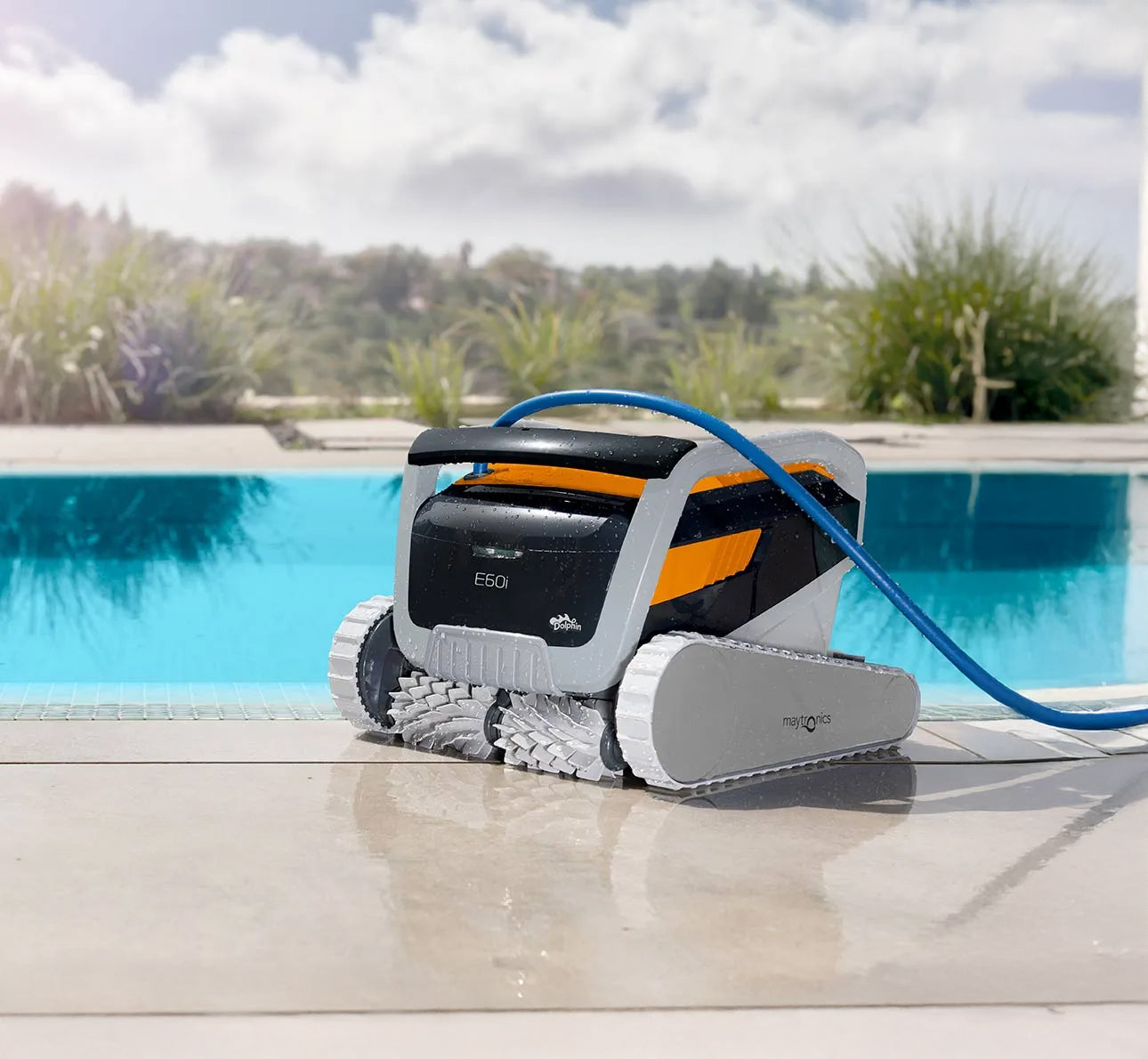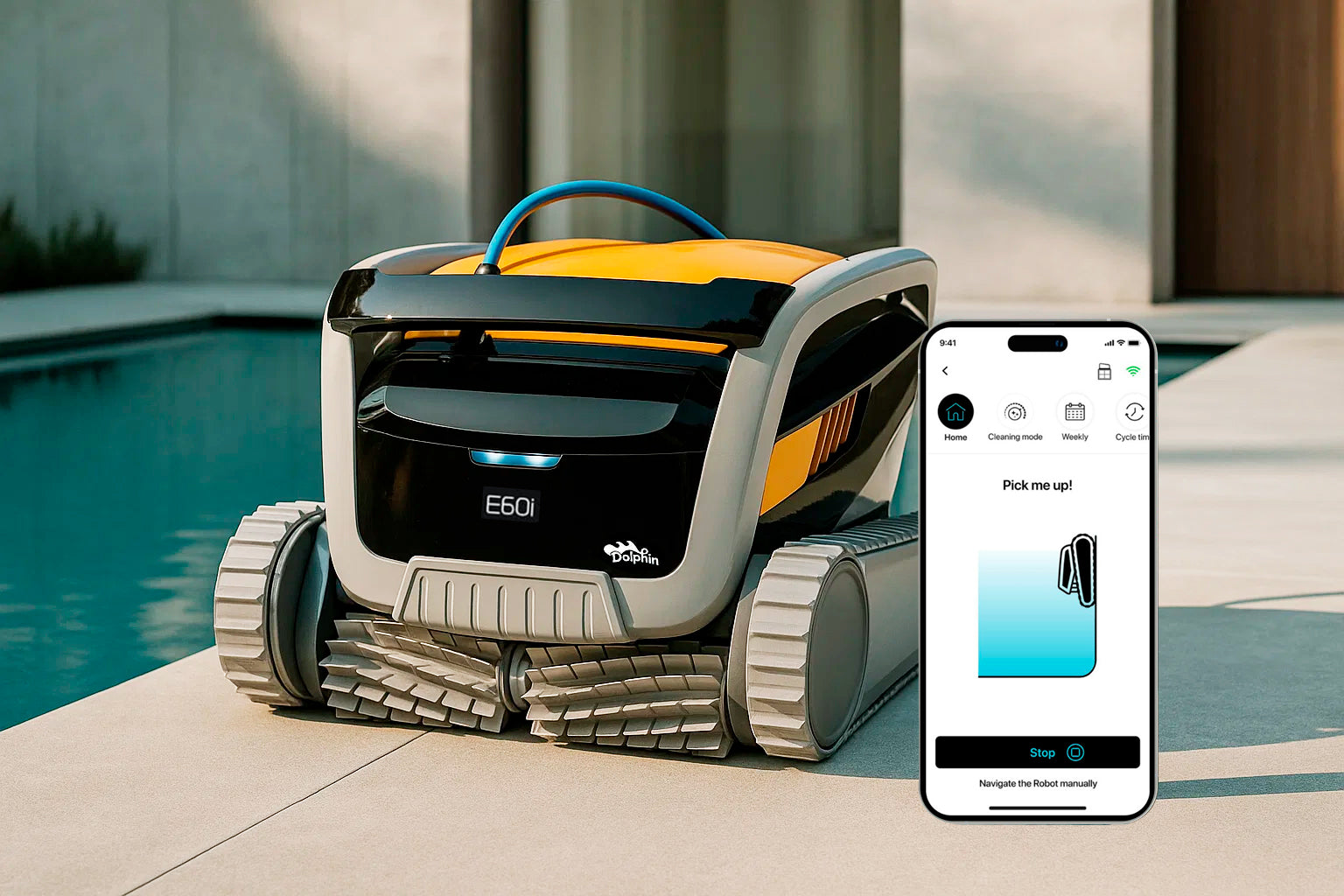 El Dolphin E60i es el tope de gama de la serie "E", la nueva incorporación a la gama trae un arsenal de tecnología para que el usuario pueda disfrutar de uno de los robots más avanzados del mercado. La aplicación MyDolphin Plus aparece en su versión completa para ofrecer al usuario funciones como el "Pick Me Up" para que el robot te espere en la línea de flotación a que lo recojas o el indicador de filtro lleno para saber cuando hay que sacar al robot de la piscina y vaciar el filtro.