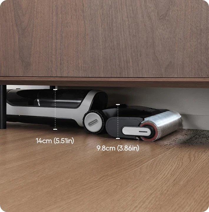 El H14 Pro se ajusta completamente al suelo y puede acceder a huecos muy estrechos, de apenas 14 cm de altura con el cuerpo completo y 9,8 cm únicamente con el cabezal de cepillado¹. Además, su eje giratorio facilita un movimiento ágil en zonas de difícil acceso, mientras que la rueda multifunción trasera protege las superficies frente a arañazos y ayuda a reducir el esfuerzo y la fatiga al levantarlo.