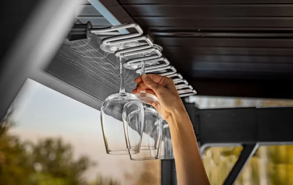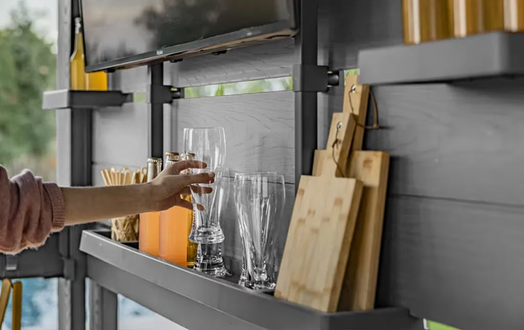 Bar Gazebo en color gris, diseñado para crear un espacio exterior funcional y elegante. Fabricado en materiales resistentes a la intemperie, ofrece una amplia superficie para preparar y servir bebidas, ideal para terrazas, jardines o zonas de piscina.