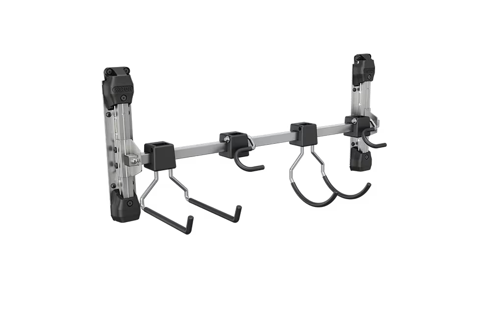 Colgador multiusos Keter en metal color negro, diseñado para mantener organizadas herramientas, mangueras o accesorios. Ideal para casetas, garajes o zonas de trabajo, con instalación sencilla y segura.
