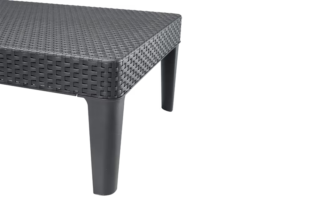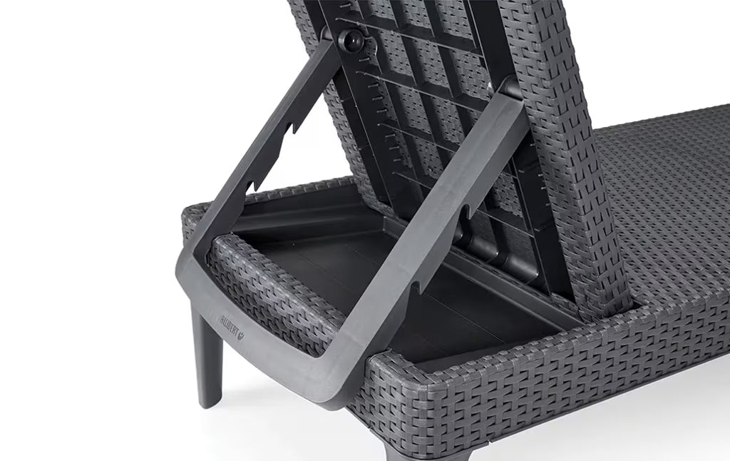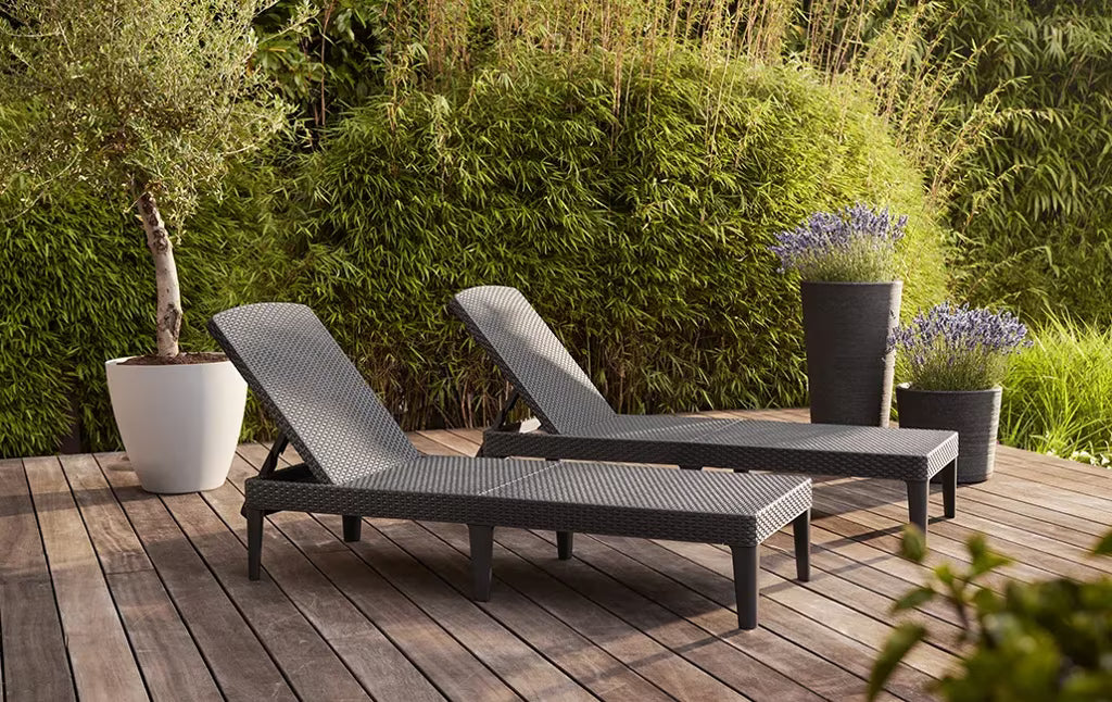 Tumbona Jaipur en color grafito, ideal para disfrutar del sol junto a la piscina o en el jardín. Fabricada en resina trenzada efecto ratán, combina confort, resistencia y estilo moderno.