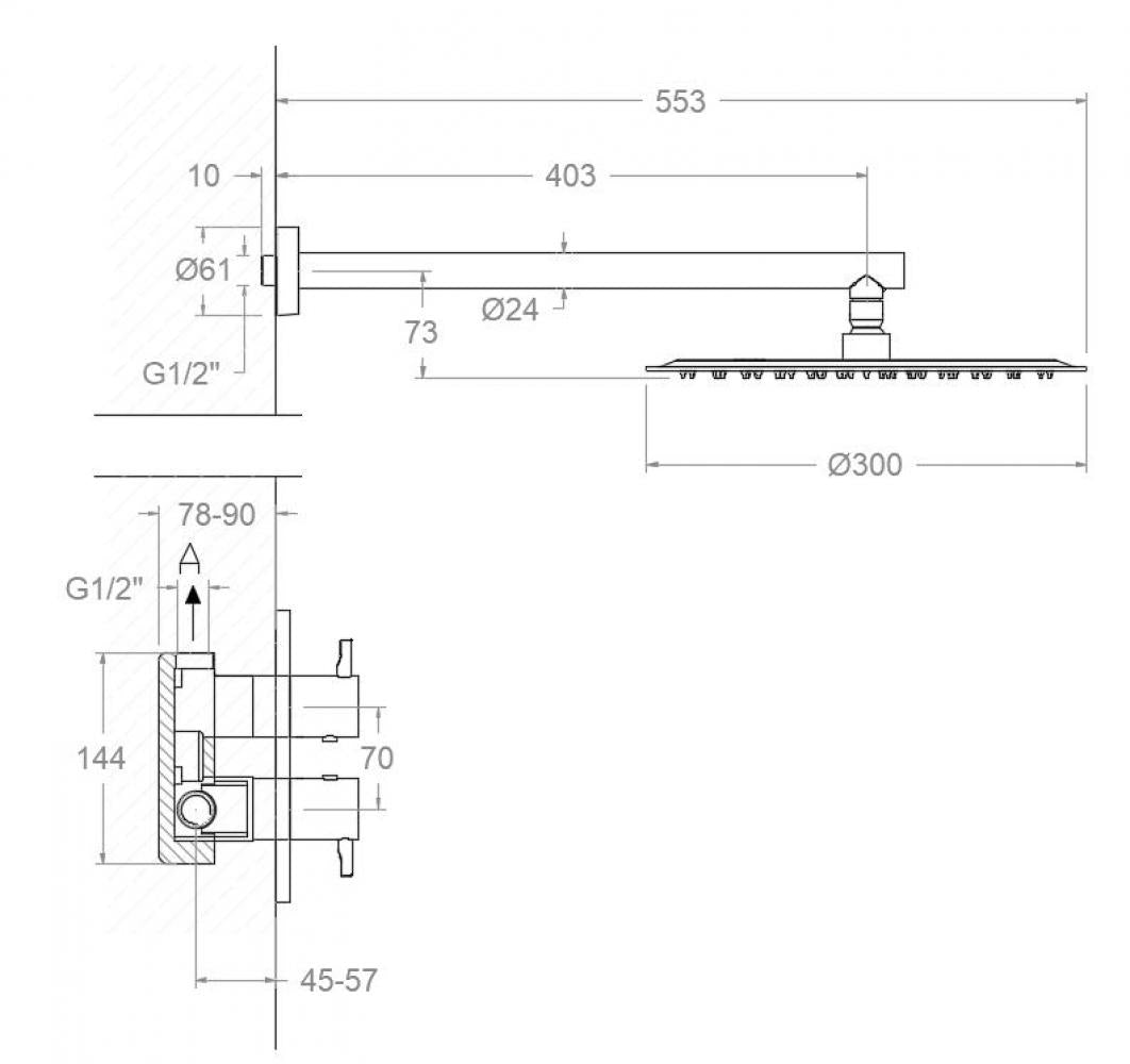 El conjunto de ducha empotrado termostático Ramon Soler Odisea de 1 vía con rociador metálico Ø300 mm y acabado negro mate combina tecnología, confort y diseño contemporáneo. Fabricado en latón de alta calidad con recubrimiento PVD negro mate, ofrece una excelente resistencia a la corrosión, la humedad y el uso diario. Su sistema termostático de alta precisión mantiene la temperatura constante, garantizando seguridad y bienestar térmico. El rociador metálico de gran diámetro proporciona un flujo amplio y envolvente, mientras que su diseño empotrado minimalista aporta una estética moderna y elegante.