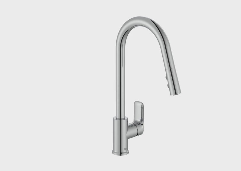 La grifería para cocina Roca Cala A5A816EC00 con caño curvo giratorio y ducha extraíble de 2 funciones en acabado cromado está pensada para ofrecer máxima funcionalidad y confort en el uso diario de la cocina. Su caño curvo giratorio proporciona un amplio radio de acción, ideal para fregaderos grandes o de doble seno, mientras que la ducha extraíble de 2 funciones permite alternar entre chorro normal y spray para adaptarse a distintas tareas como el aclarado de alimentos o la limpieza del fregadero. Incorpora la tecnología Cold Start, que ayuda al ahorro energético al iniciar la apertura siempre en agua fría. El acabado cromado aporta una estética limpia, luminosa y atemporal, además de resistencia y fácil mantenimiento.