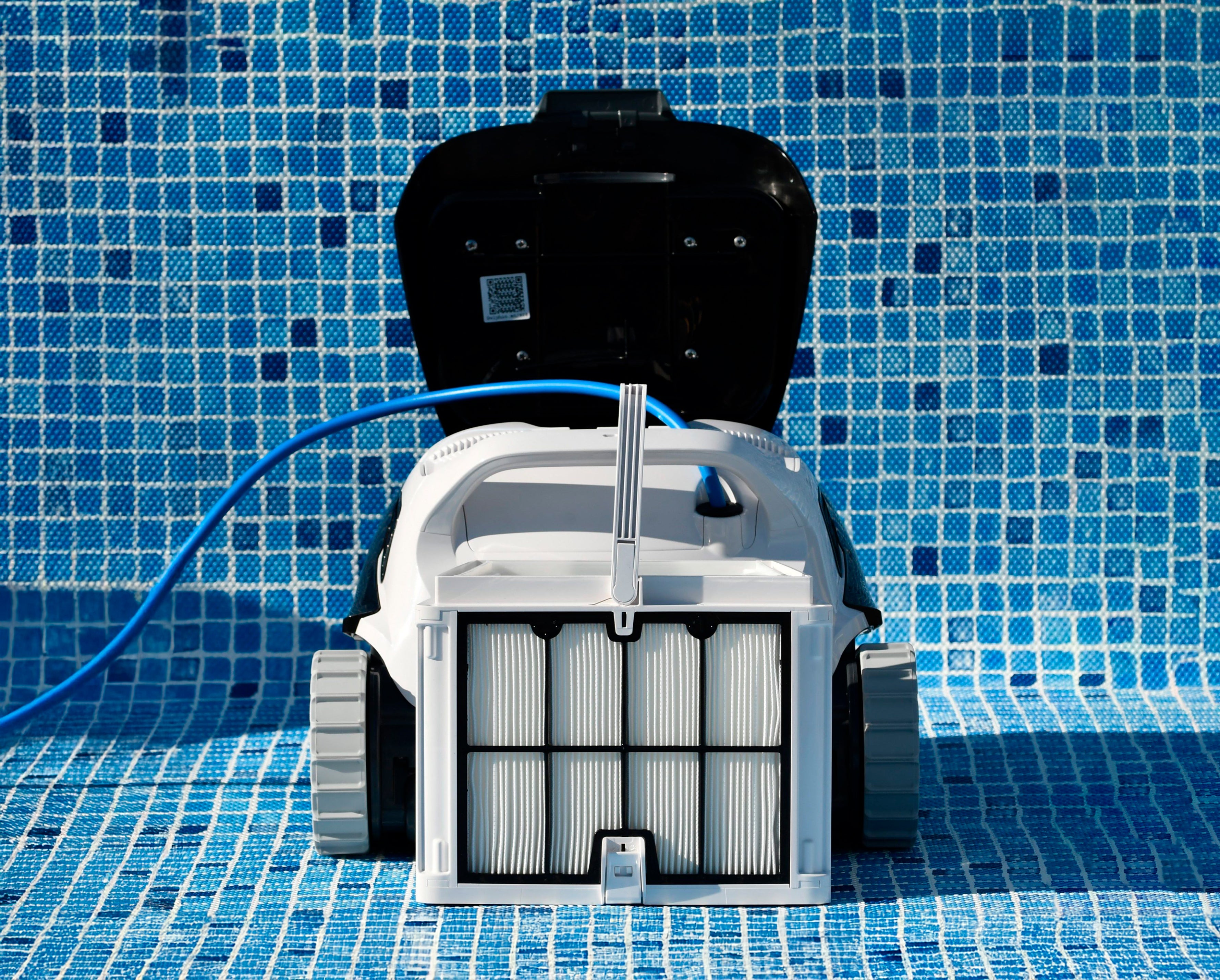 O processo é tão simples como abrir a tampa superior do robot, retirar o cesto do filtro e passá-lo por água debaixo da torneira.. Em apenas alguns minutos, os detritos como folhas, areia ou sujidade fina são removidos, deixando os filtros prontos para um novo ciclo de limpeza.