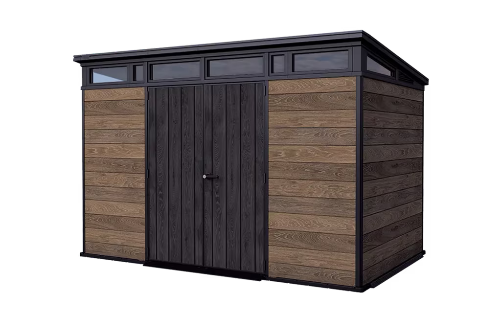 A casota de jardim Signature Walnut 11x7 é a solução definitiva de armazenamento exterior da coleção premium Signature da Keter, concebida para oferecer grande capacidade com um acabamento elegante que mantém o aspeto natural da madeira. As suas paredes são fabricadas com o material Decocoat, inovador e de vanguarda, pensado para resistir às intempéries sem manutenção e conservar um aspeto impecável temporada após temporada.