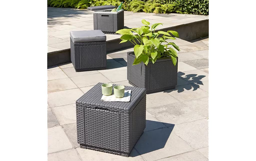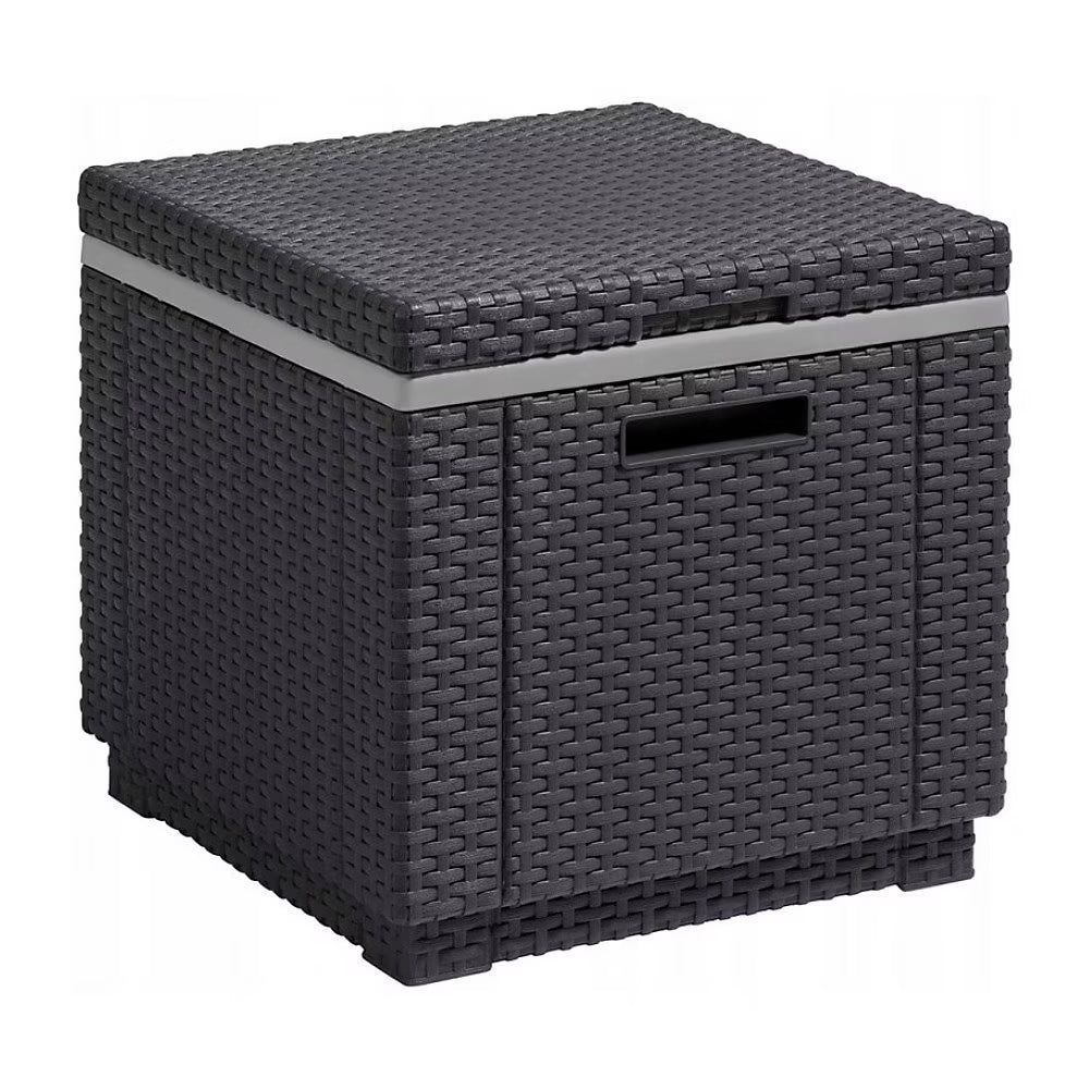 Frigorífico Ice Cube na cor grafite, com design moderno e funcional ideal para manter as bebidas frias no exterior. A sua estrutura compacta e resistente permite também usá-lo como mesa auxiliar ou assento, perfeito para terraços, jardins e zonas de piscina.