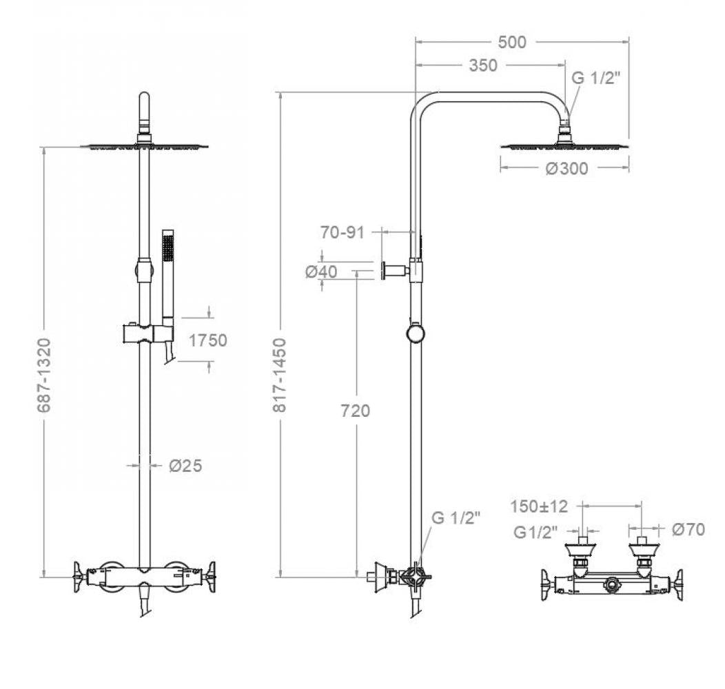 O coluna de duche inclui um chuveiro suspenso, um chuveiro de mão, um corrimão e torneiras integradas. O conjunto de duche normalmente inclui chuveiro de mão, mangueira e suporte, concebido como um complemento económico e funcional.